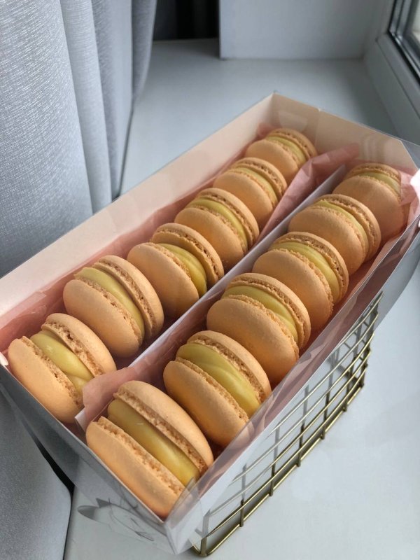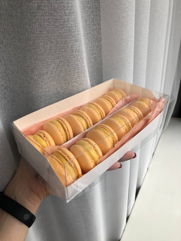 Отличная коробка, собирается очень легко, в комплекте идёт ложемент-разделитель, который при желании можно вообще не использовать (например, если вы упаковываете не макарон, а более крупные десерты). У меня в эту коробку уместилось ровно 12 макарон, размер крышечек у меня обычно 3,5-4 см. Если у вас макарон побольше или потолще, то, возможно, уместится чуть поменьше, чем 12 штук. Но коробочка отличная, прозрачная крышка обеспечивает максимальную обзорность десерта, смотрится очень презентабельно и эстетично.