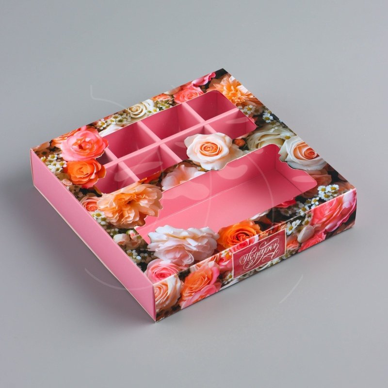 Коробка на 8 конфет и плитку шоколада с окном "Розы" 17,7х17,8х3,8 см